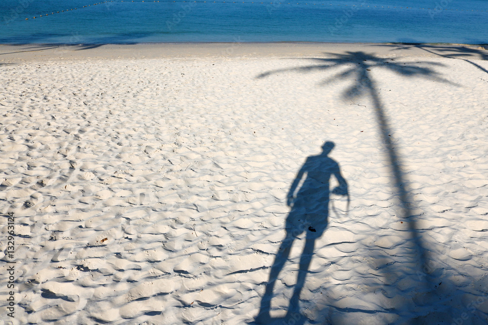 Shadow of people and coconut palm tree on the beach.