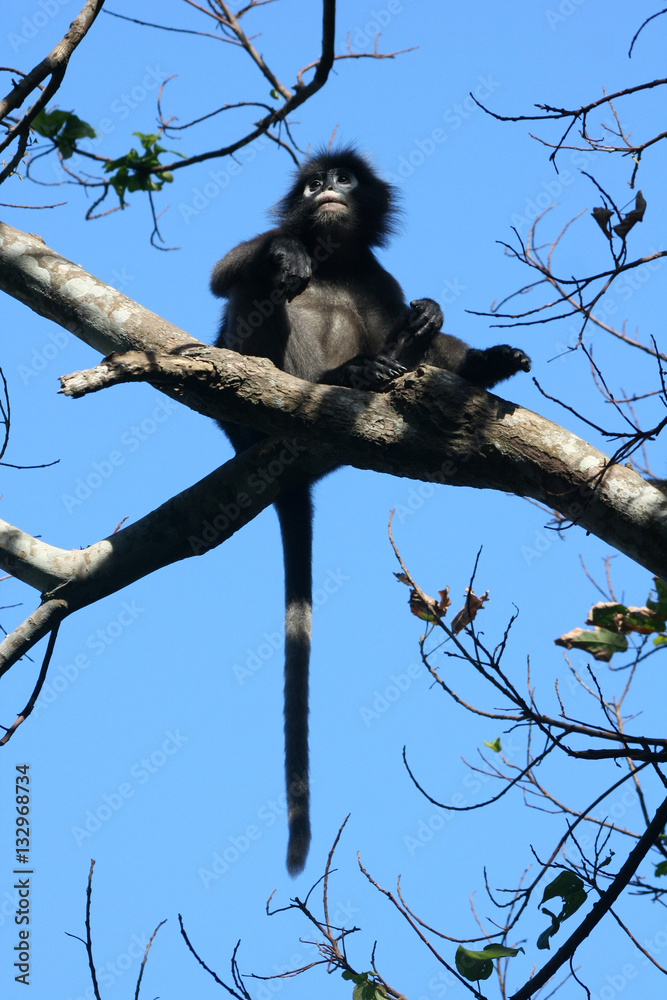 Leaf Monkey, Duskey Langur eating leaves on trees.