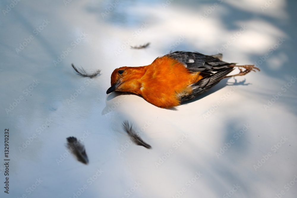 Dead birds on the ground becausefly into theglass. Orange-headed Thrush.