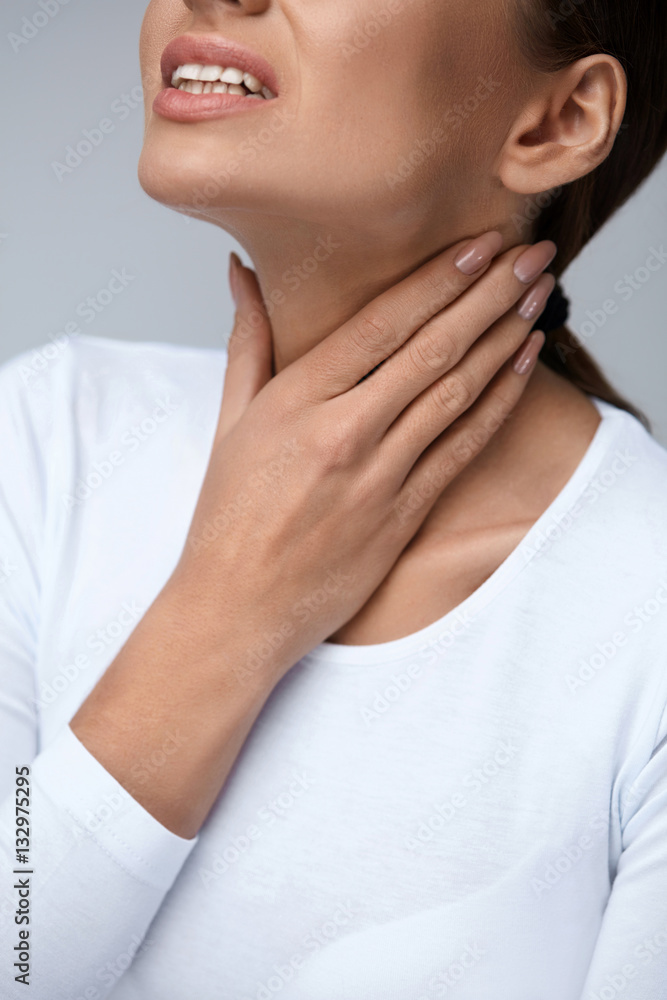 Throat Pain. Closeup Woman With Sore Throat, Painful Feeling