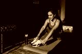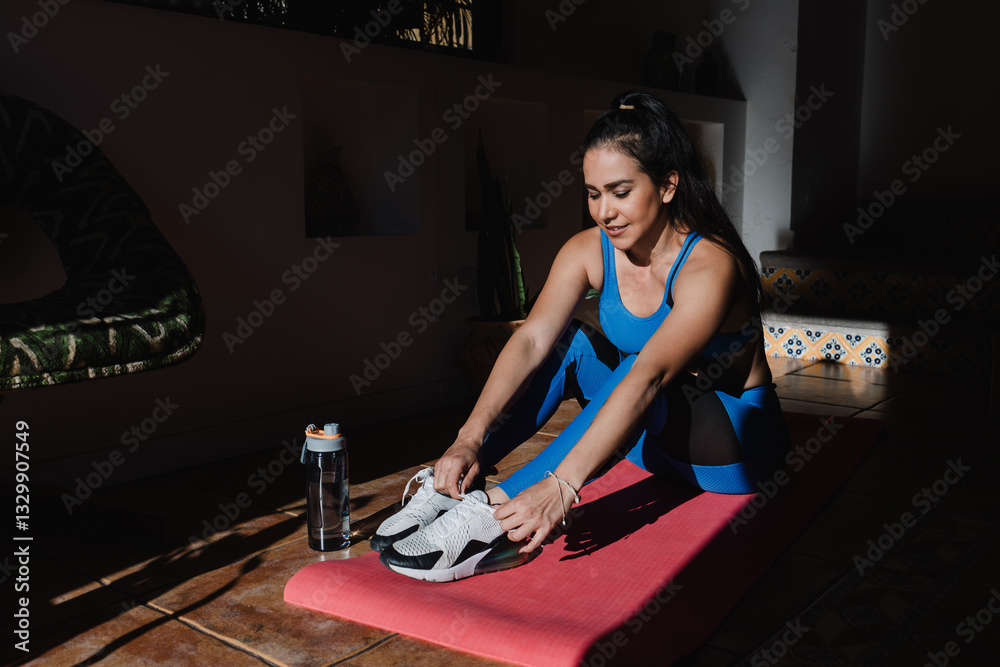 young latin woman tying his shoes for exercise at home in Mexico Latin America, hispanic female at home workout
