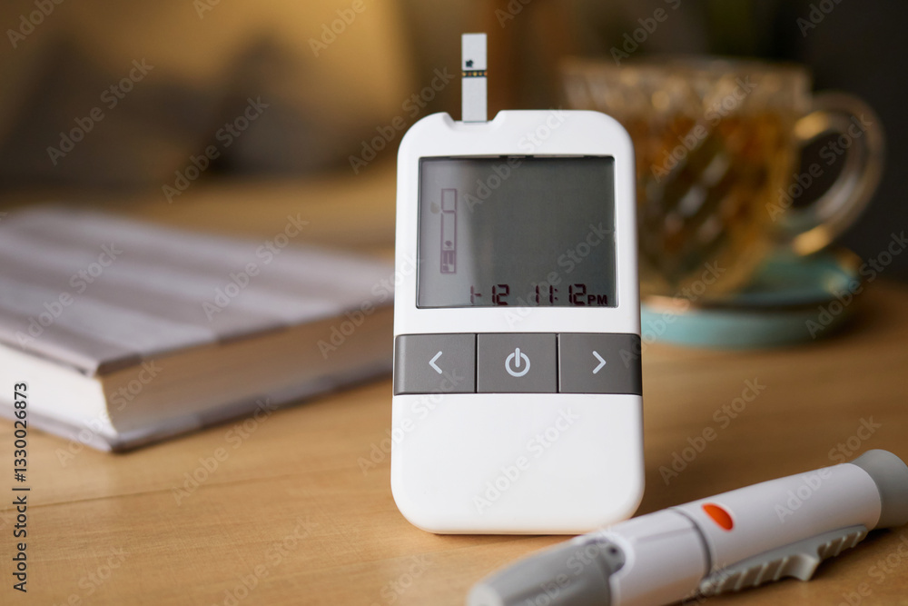 A glucometer sits on a wooden table, displaying the time and ready for a blood sugar test. Nearby, a cup of tea and an opened notebook add to the setting