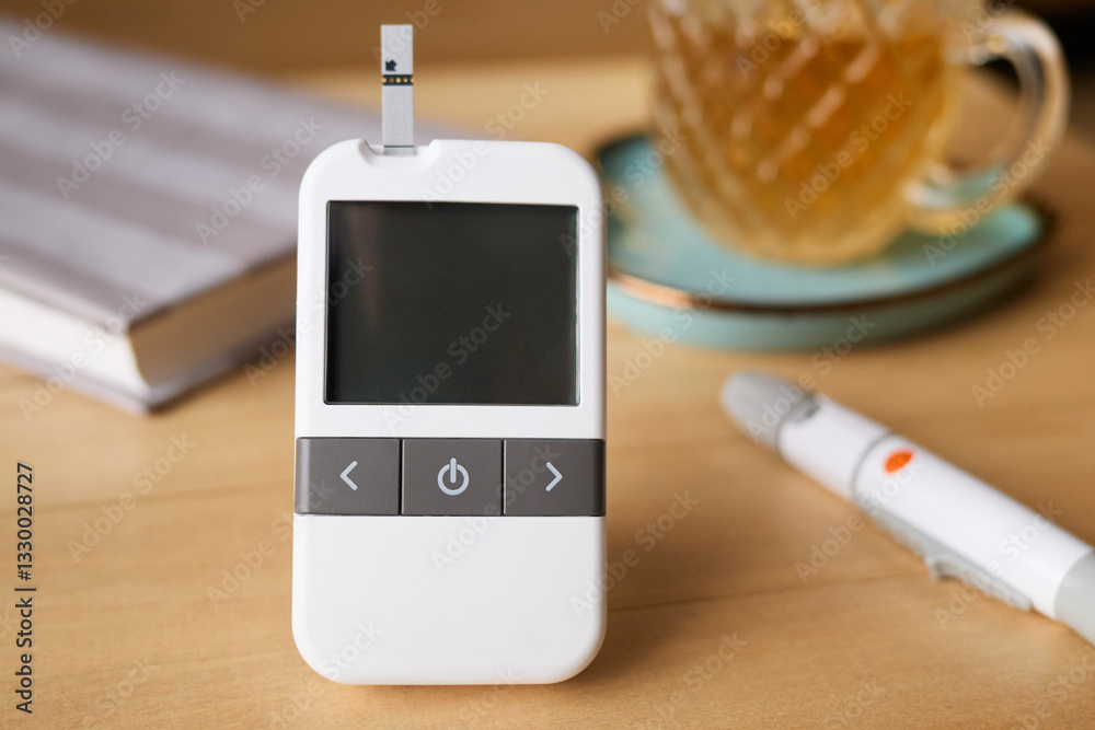 A glucometer rests on a wooden table beside a drink, ready for a blood sugar test. A pen for insulin dosage is also visible, indicating health management focus