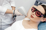 A young beautiful brunette lying on a couch in a beauty salon during a laser hair removal procedure for underarms. Concept of modern care and effective treatments in the world of cosmetology and spa.