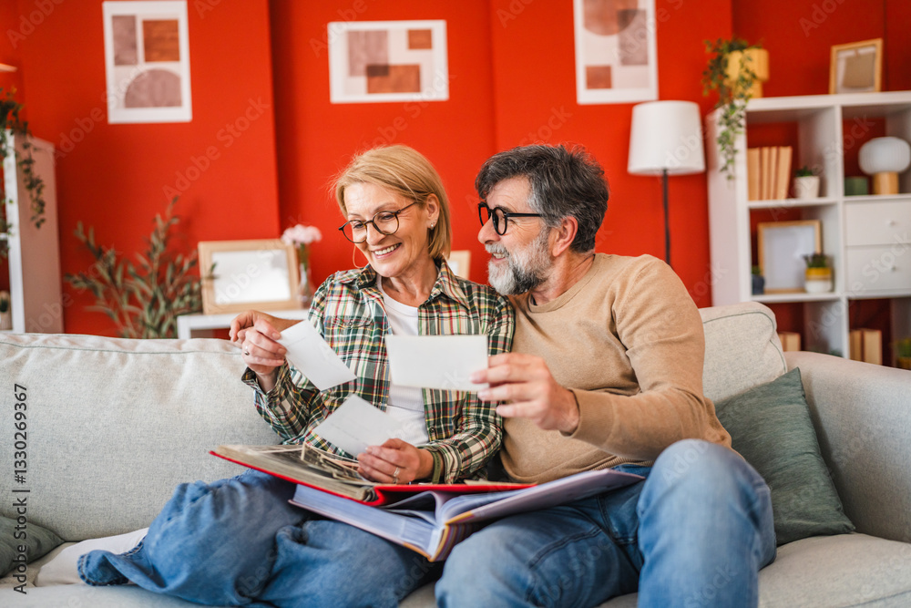 husband and wife stand and watch family photo album in the living room