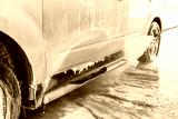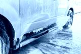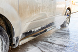 Close-up of a car being washed with high-pressure water and foam at a self-service car wash, focusing on the wheel and side panel covered in soap suds