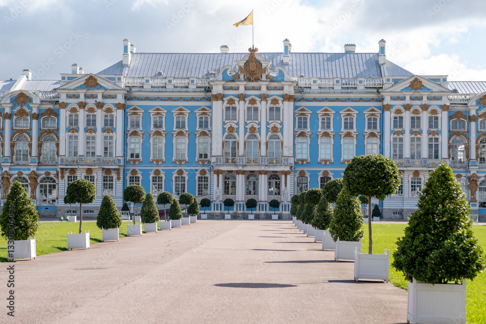 Beautiful architectural view of the Great Catherine Palace with vibrant gardens and neatly trimmed topiaries in Tsarskoye Selo