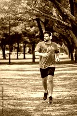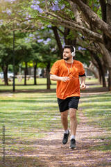 Hombre corriendo en un parque urbano en un hermoso día soleado. Hombre trotando mientras escucha música