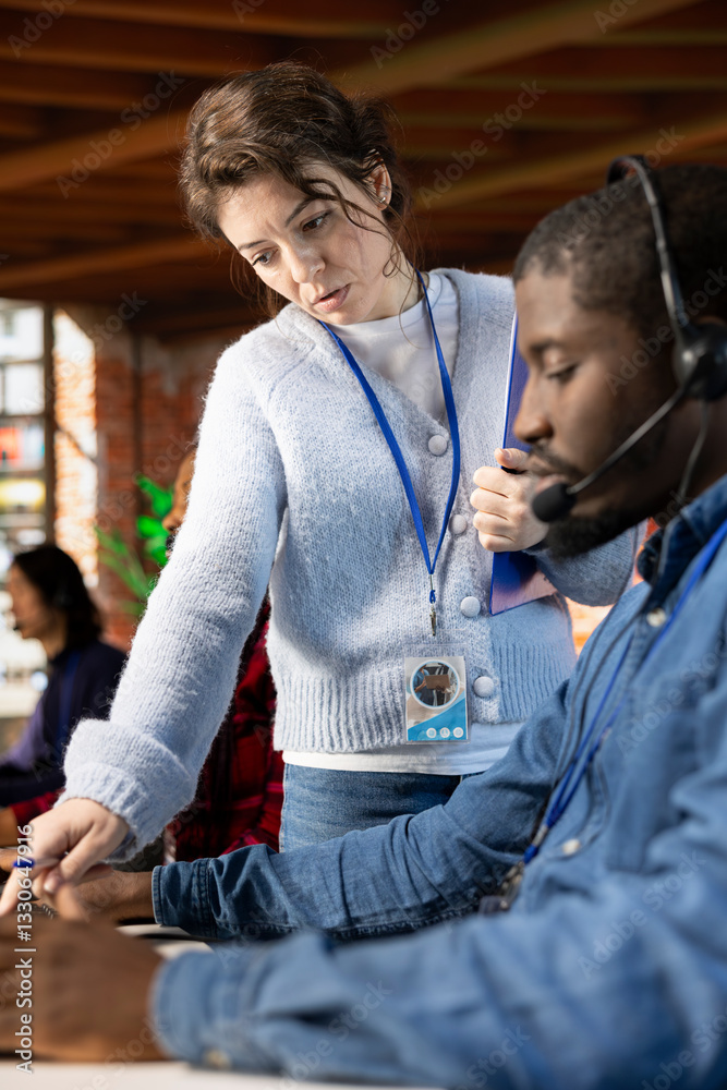 Call center manager providing guidance to african american intern, addressing questions. Customer service workplace onboarding specialist conducting orientation sessions for new agent, close up