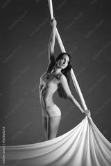 Young beautiful slim dancer with white aerial silk posing on a black studio background.