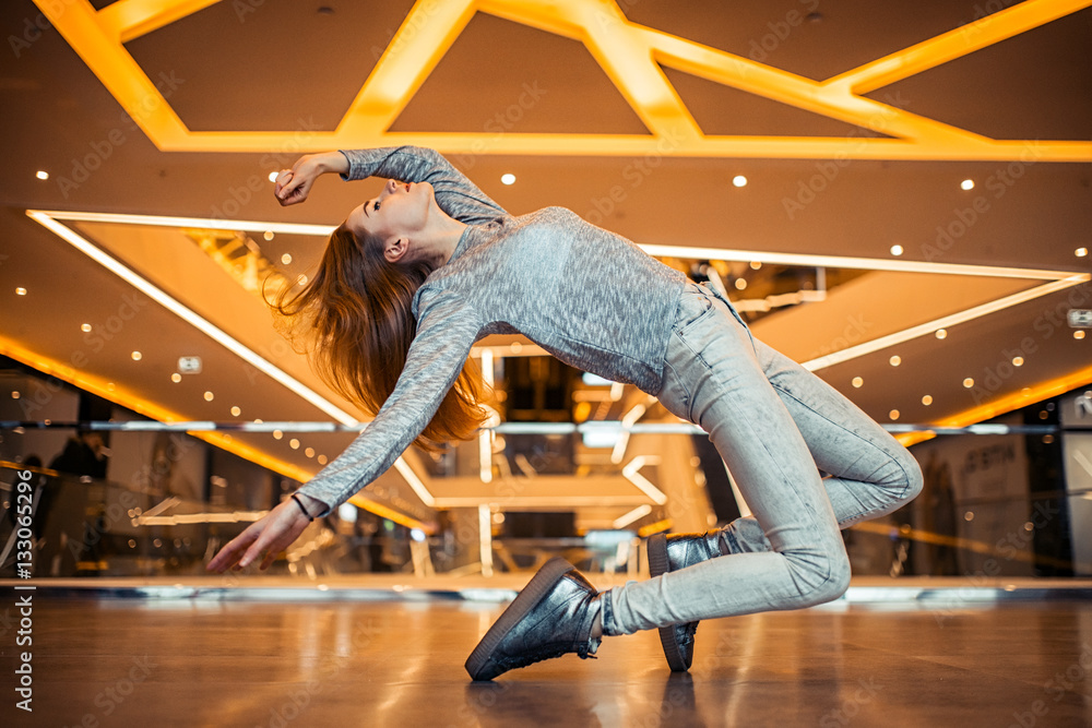 Young girl dancer in gray on the trade center