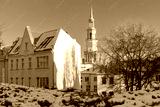 Winter cityscape in Poznan, Poland, featuring the tower of the historic Town Hall rising above snow-covered rooftops