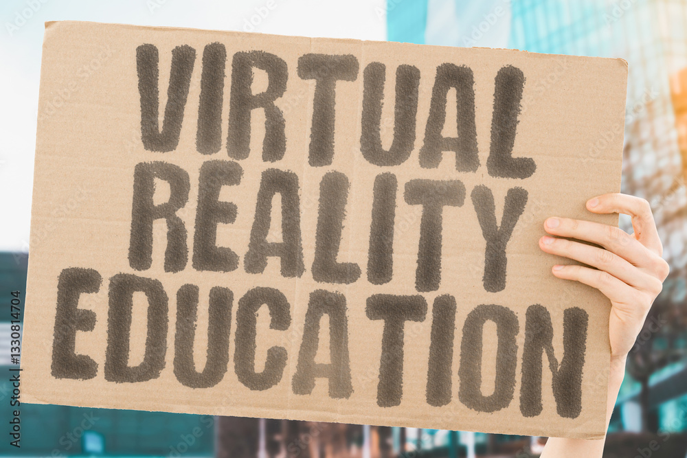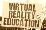 "Virtual reality education" on worn cardboard. Highlights VR-based learning in schools. IMMERSION. SIMULATION. INTERACTIVE. EXPERIENCES. CURRICULUM. TRAINING. ENVIRONMENTS