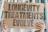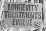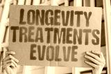 "Longevity Treatments Evolve" on worn cardboard. Highlights new medical methods for lifespan extension. BIOTECHNOLOGY. GENETICS. THERAPIES. REJUVENATION. PREVENTION. RESEARCH. AGEING