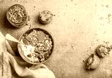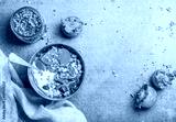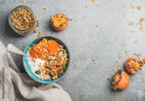 Healthy vegetarian breakfast. Oatmeal, quinoa granola with yogurt, dried fruit, seeds, honey, fresh persimmon in blue bowl over grey background, top view, copy space. Dieting, allergy-friendly concept
