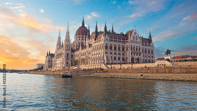 Hungarian parliament building reflecting on danube river at sunset in budapest, hungary