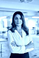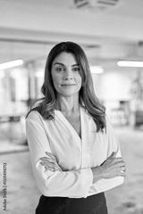 Confident mid aged professional business woman corporate leader, happy mature female executive, elegant lady manager of middle age standing in office arms crossed looking at camera, vertical portrait.