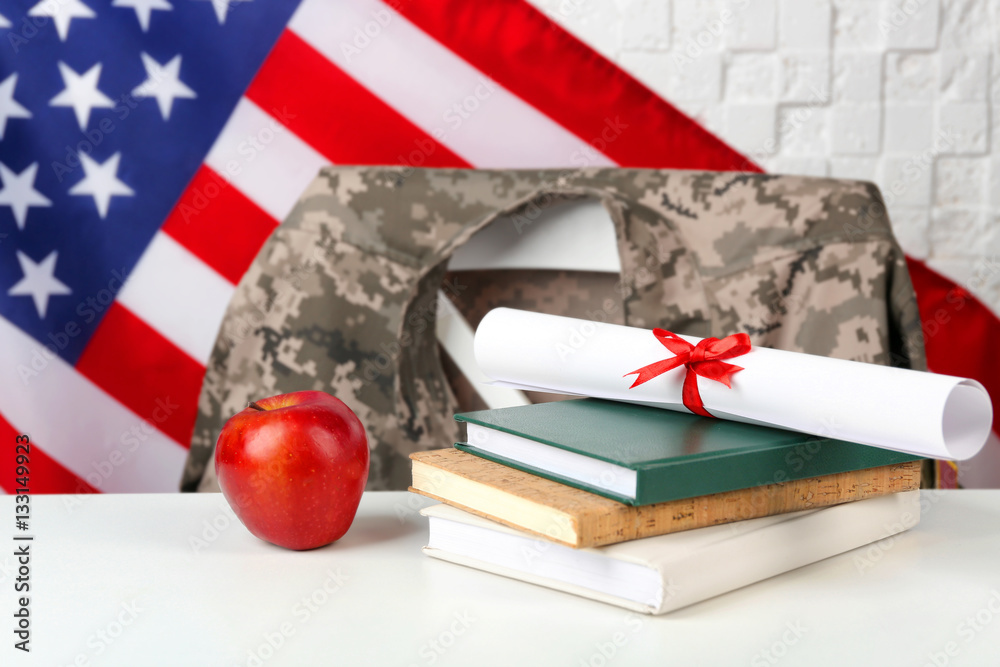 Books, apple and diploma on white table. USA military education concept
