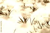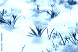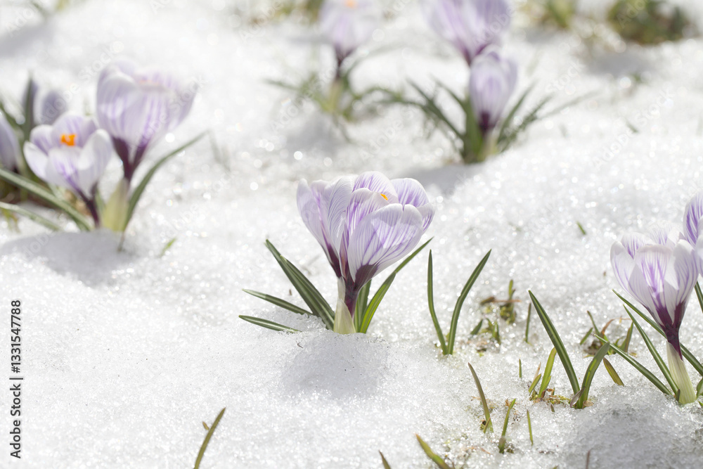 White crocuses on sparkling snow background, beautiful spring flowers. Easter and Mother's Day card template.