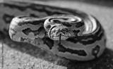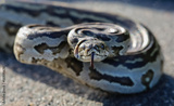 African rock python laying on the road in attack posture, Kruger National Park, South Africa