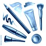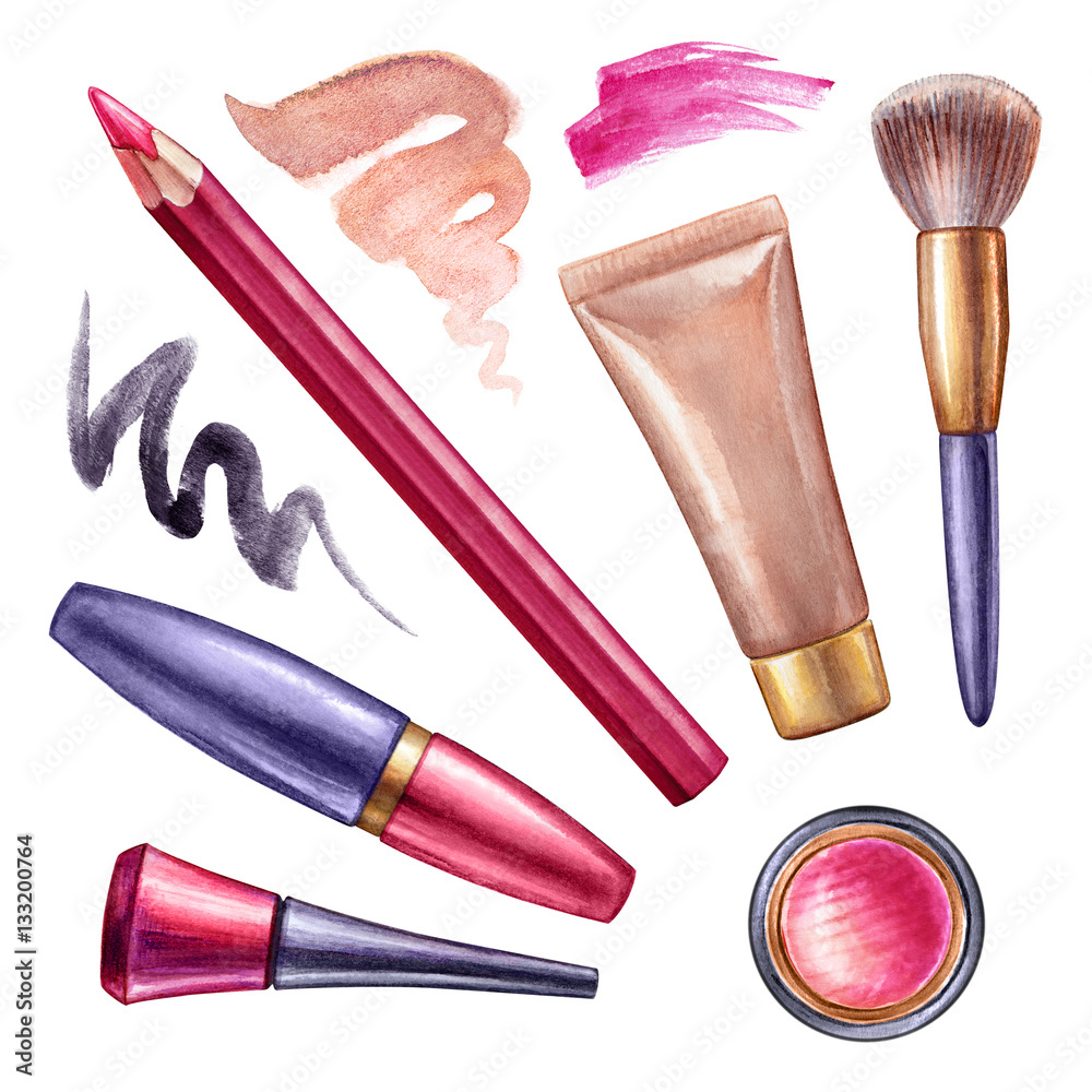 watercolor illustration, make up design elements, fashion trend, decorative cosmetics, accessories