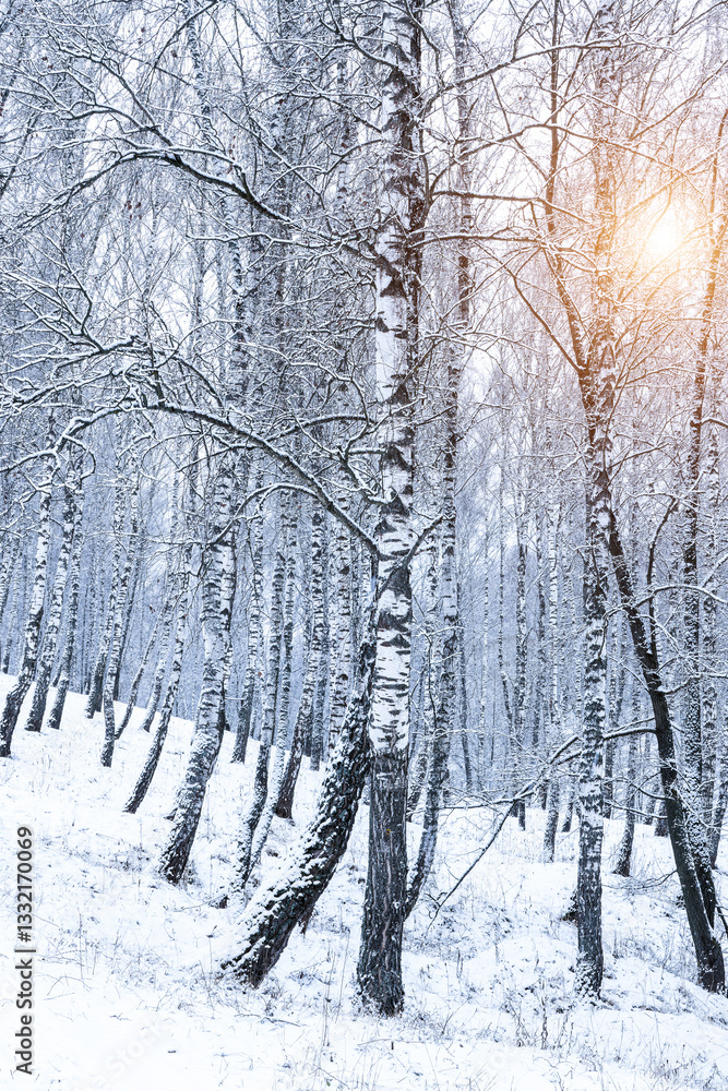 Birch grove after a snowfall on a winter. Sunlight breaking through the branches.