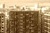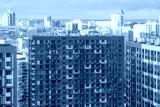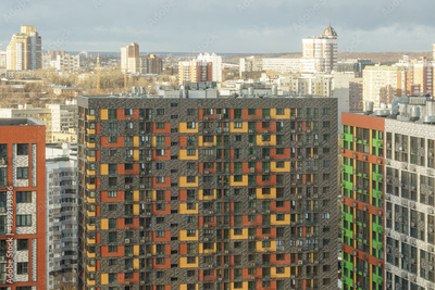 Modern apartment buildings with colorful facades and cityscape in daylight.