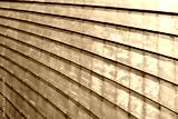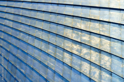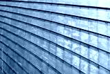 Close-up of blue metal roof panels with light reflections. Abstract background.