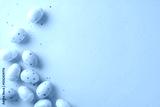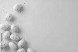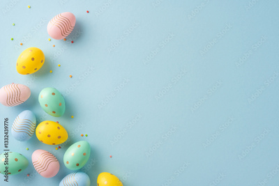 Pastel-colored Easter eggs with decorative designs arranged on a soft backdrop, accompanied by small confetti scattered for a festive holiday feel