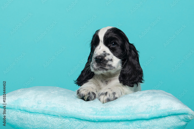 Cute cocker spaniel puppy lying on a blue cushion on a blue background