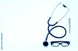 Top view of modern, sterile doctors office desk. Medical accessories on a white table background with copy space around products. Photo taken from above.