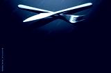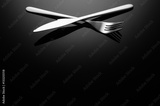 Black food background. Stainless steel, modern silverware on black background with reflection. Image with copy space. Symbol or concept for diners, cafes and good food competitions and festivals