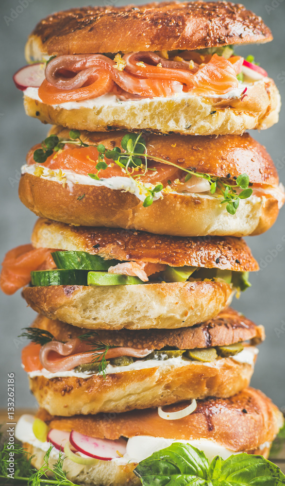 Heap of Bagels with salmon, eggs, vegetables, capers, fresh herbs and cream-cheese, grey concrete background, vertical composition. Healthy breakfast, lunch or take-away food concept