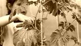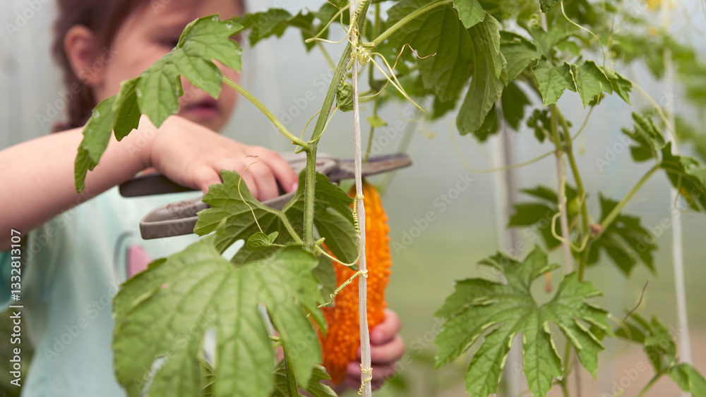 Cultivation of harantzia momordica in the greenhouse. A little girl garden scissors cut ripe orange fruit from the liana. Fragment.