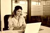 Smiling middle aged senior female operator wearing headset working using laptop computer in office. Busy mature business woman call centre representative customer support agent talking to client.