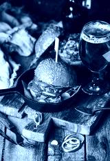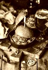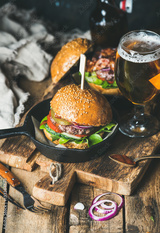 Homemade beef burgers with crispy bacon and vegetables in small pan and glass of wheat beer on rustic serving board over shabby wooden background, selective focus, vertical composition