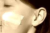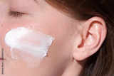 Beauty skincare close up portrait of a young woman with moistunizer on her face. Domestic skin care treatments.