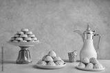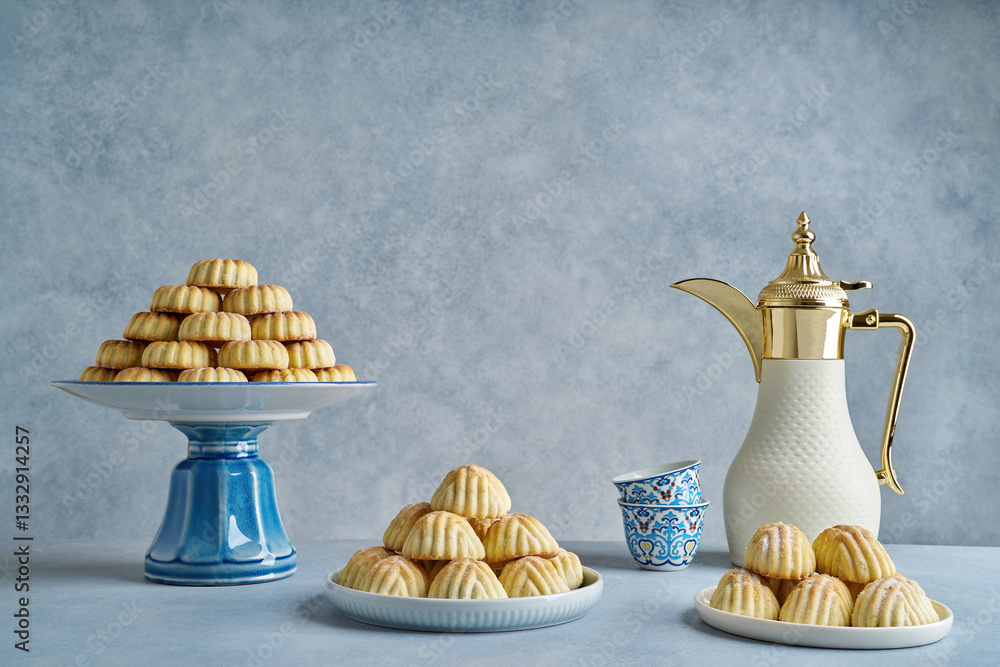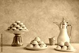 Assorted semolina maamoul or mamoul cookies with dallah . Traditional arabic Eid al Adha, Eid al Fitr sweets