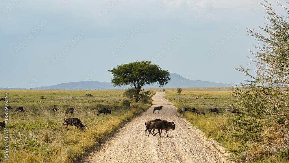 Experiencing a Fascinating Wildlife Encounter on a Serene African Road Through Nature Serengeti Tanzania Africa