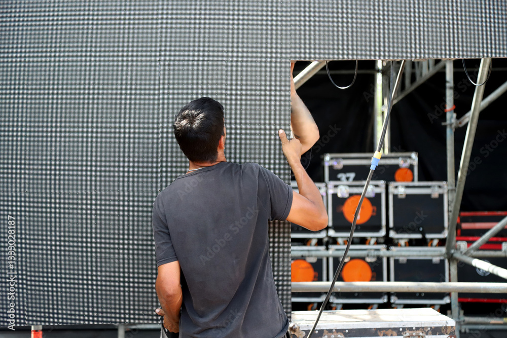 Technicians working on stage assembling giant LED screen panels for rock event. Men working on music show production