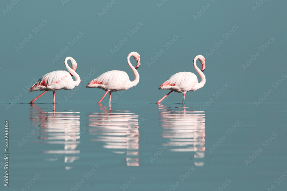 African wild birds. A flock of great flamingos on the blue lagoon against the bright sky