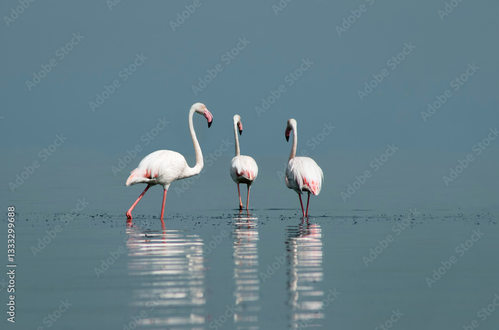 African wild birds. A flock of great flamingos on the blue lagoon against the bright sky