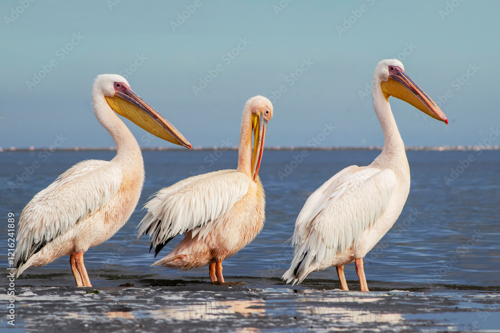 African wild birds. Great pelicans on the blue lagoon on a summer morning