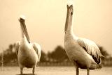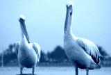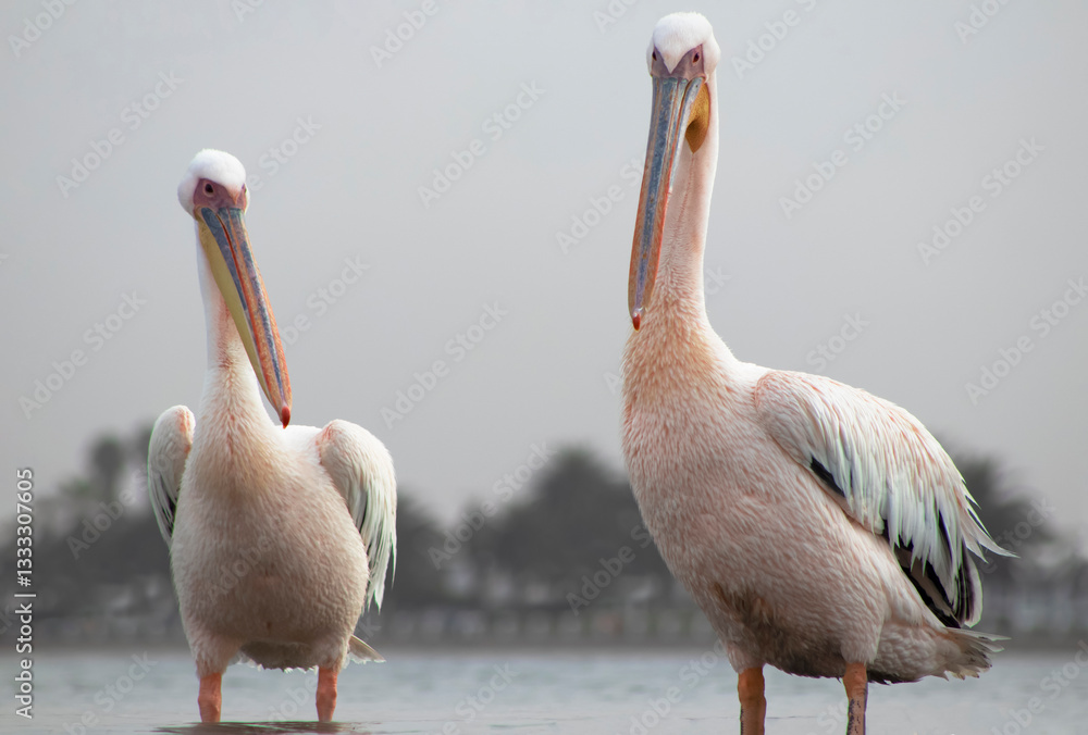 African wild birds. Great pelicans on the blue lagoon on a summer morning