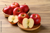 Red apple fruit (Gala apple) on wooden plate with wooden background