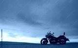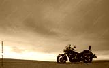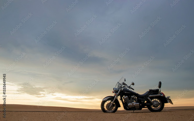 A lone motorcycle stands on the sandy surface of the Namib Desert against a dramatic cloudy sky. The sunset lighting highlights the contrast between nature and machine.