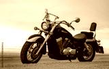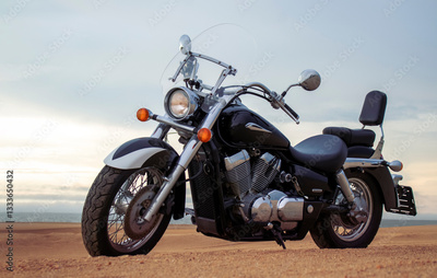 A lone motorcycle stands on the sandy surface of the Namib Desert against a dramatic cloudy sky. The sunset lighting highlights the contrast between nature and machine.