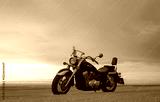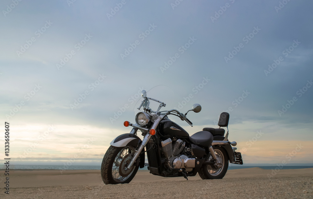 A lone motorcycle stands on the sandy surface of the Namib Desert against a dramatic cloudy sky. The sunset lighting highlights the contrast between nature and machine.