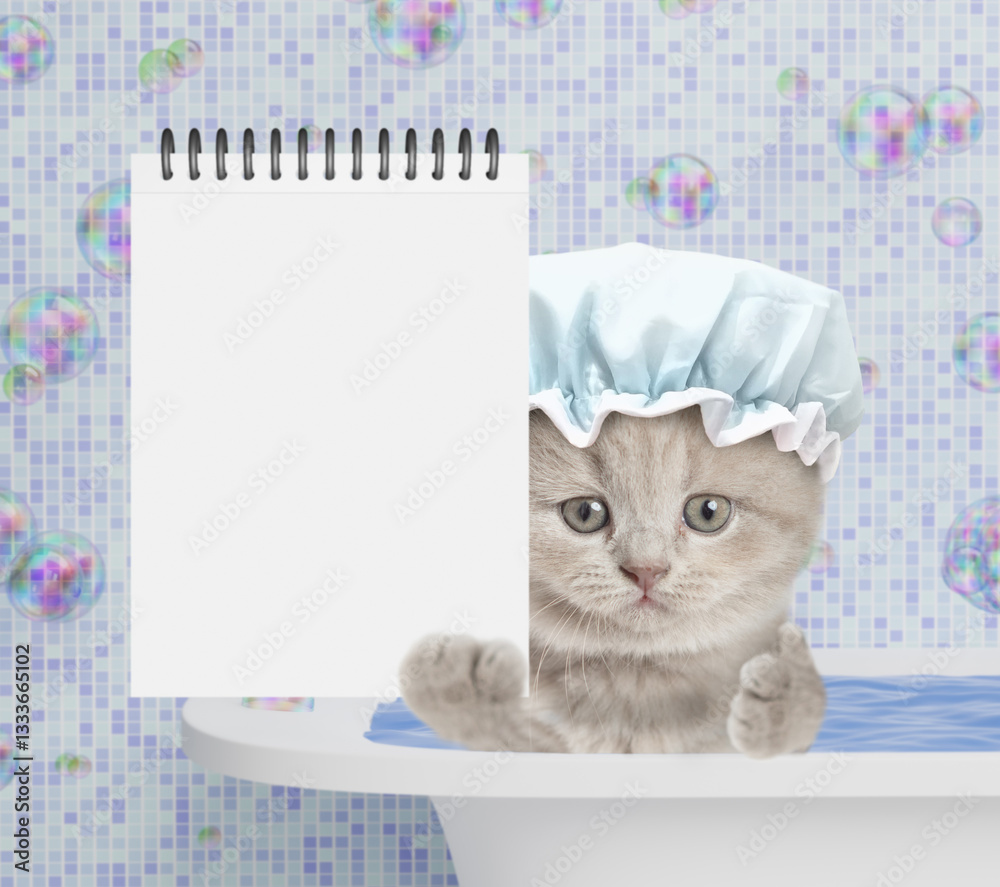 Cute kitten wearing shower cap takes the bath at home and shows blank white notepad in it paw. Empty space for text