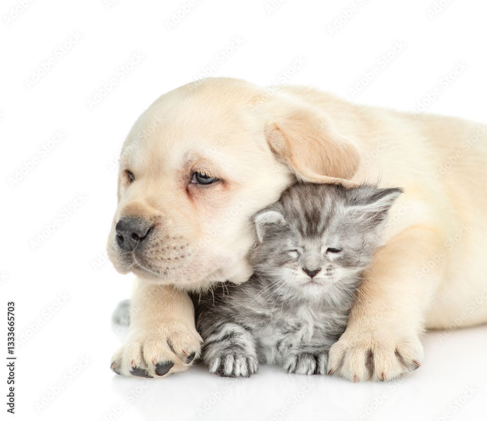 Golden retriever puppy hugs a sleepy maine coon kitten and looks at camera. isolated on white background.